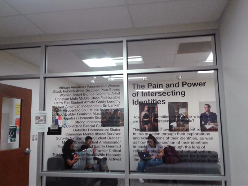 This exhibition deals with the subject of intersectionality through photography. Each photo is a portrait of a person and has a caption describing the intersecting identities at play with each person. All the photographs are by SU students.