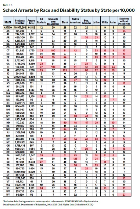 that gives numbers and rates of school arrests by race and disability status by